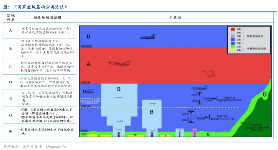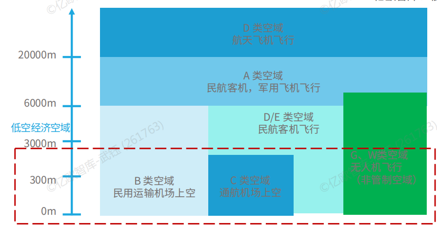 目前,低空领域以3000米以下非管制空域为主,覆盖通用直升机、eVTOL、无人机等飞行器,低空经济相关飞行空域主要见下图: